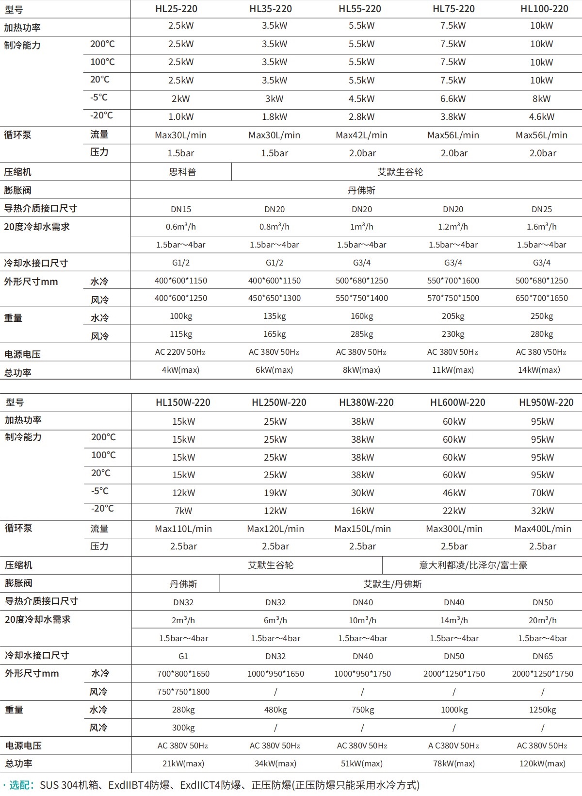 型號加熱功率制冷能力循環(huán)泵壓縮機膨脹閥導(dǎo)熱介質(zhì)接口尺寸20度冷卻水需求冷卻水接口尺寸外形尺寸mm重量電源電壓總功率